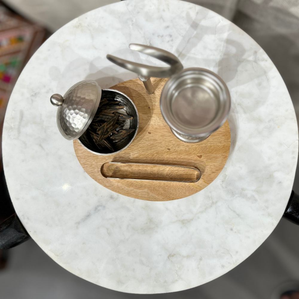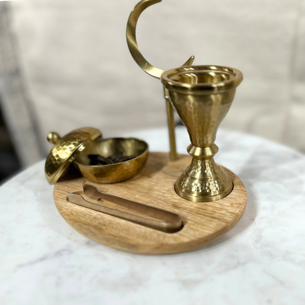 تتميز المواد المستخدمة في تصنيع طقم مبخرة عروس بجودة عالية، حيث يتكون من الخشب الطبيعي والستيل اللامع، مما يضمن لك متانة واستدامة تدوم طويلاً. الشكل الدائري للصينية مع الحواف الناعمة يضيف لمسة من الأناقة، بينما المجسم الهلالي يبرز جمال الطقم ويعكس الطابع الشرقي الأصيل.