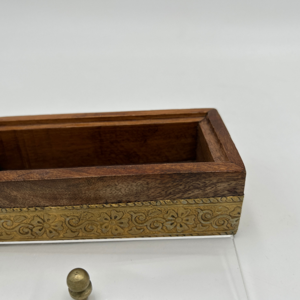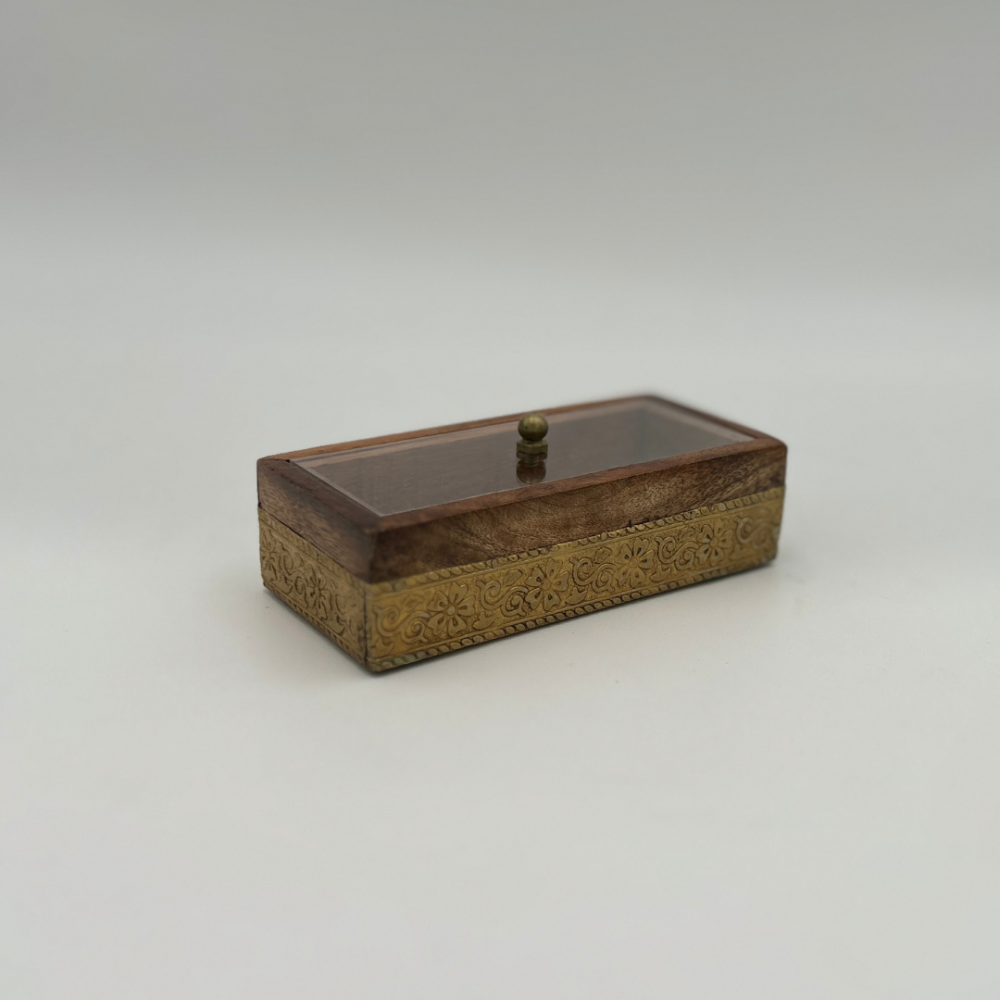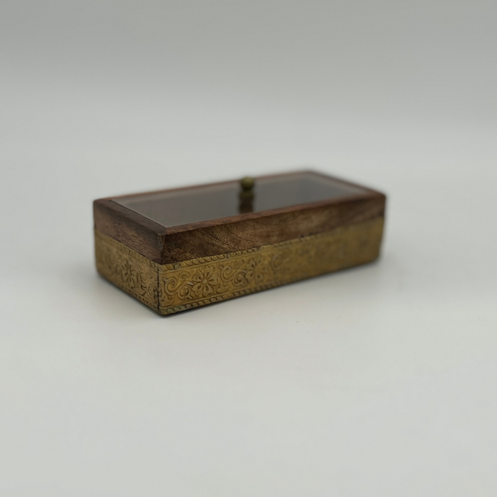 تظهر العلبة علامات الحرفية العالية من خلال تفاصيل النقوش الدقيقة على الشريط النحاسي، مما يعكس التزاماً بالجودة والفخامة. الخشب المستخدم يضمن متانة العلبة، مما يجعلها خياراً موثوقاً للاحتفاظ بممتلكاتك الثمينة.