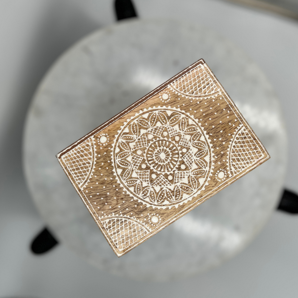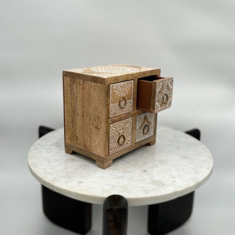 استمتع بتنظيم أغراضك مع ادراج خشبيه صغيرة، حيث يجمع منظم الأدراج الخشبي بأربعة أدراج ونقوش كلاسيكية بيضاء بين الفخامة والوظائف العملية. مصنوع من خشب المانجو الطبيعي، يتميز هذا المنظم بتصميمه الأنيق الذي يعكس لمسة من الجمال الكلاسيكي، مما يجعله إضافة مثالية لتزيين أي مساحة في منزلك.
