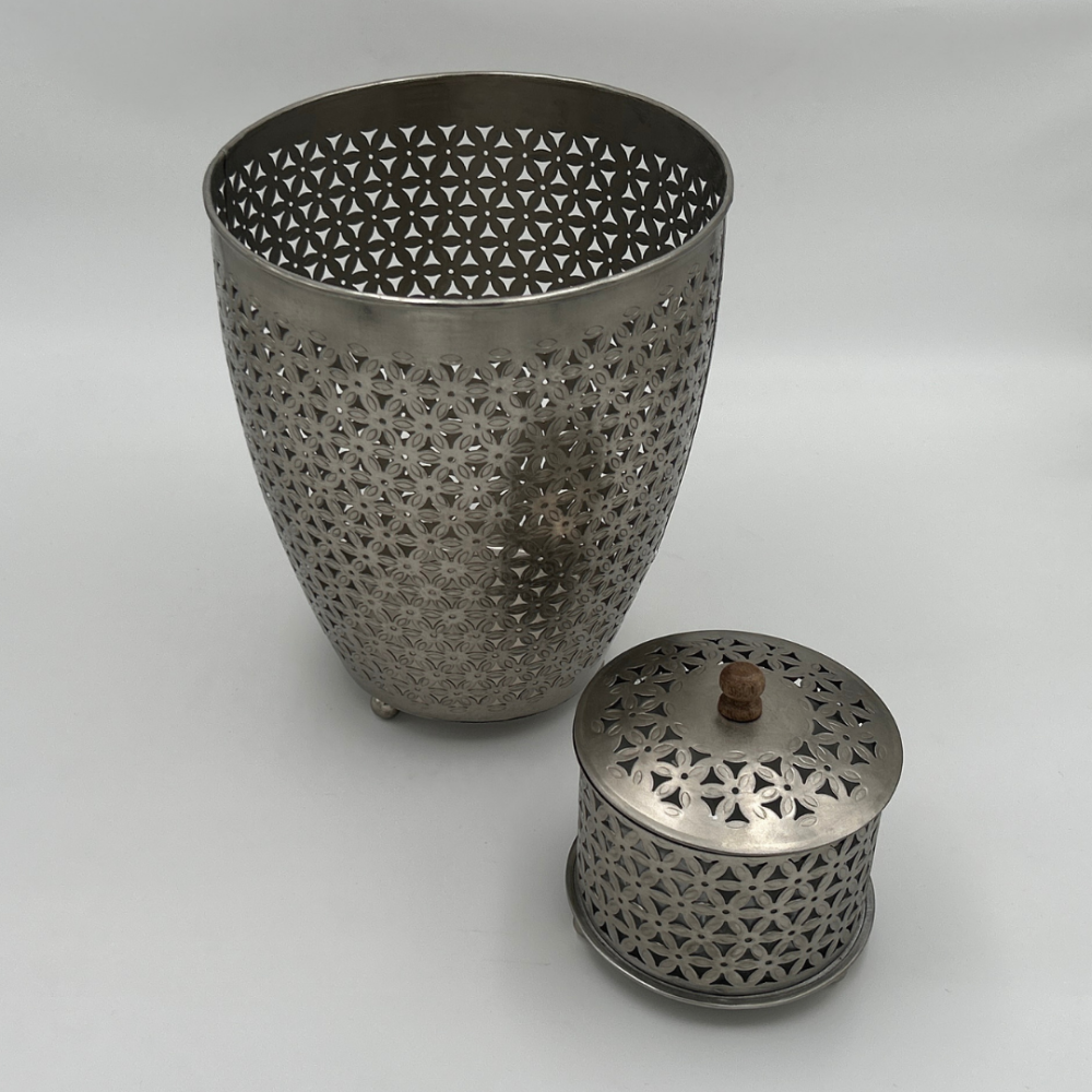 تقدم لك سلة مهملات نيو كلاسيك لمسة من الفخامة والوظيفة، حيث تجمع بين الأناقة والتصميم العصري. سلة المهملات هذه مصنوعة من ستيل فضي عالي الجودة، وتتميز بنقوش فاخرة تضفي طابعاً فريداً على أي مساحة. تصميمها الجذاب يبرز تفاصيل دقيقة تعكس ذوقك الرفيع، مما يجعلها الخيار المثالي لإضفاء لمسة من الرقي على المجالس، الصالات، أو المكاتب.