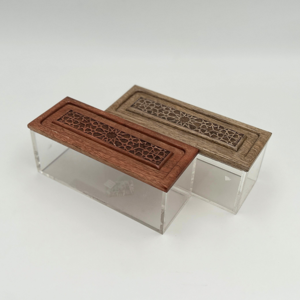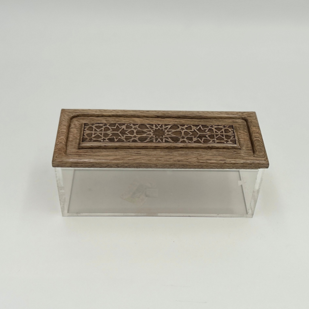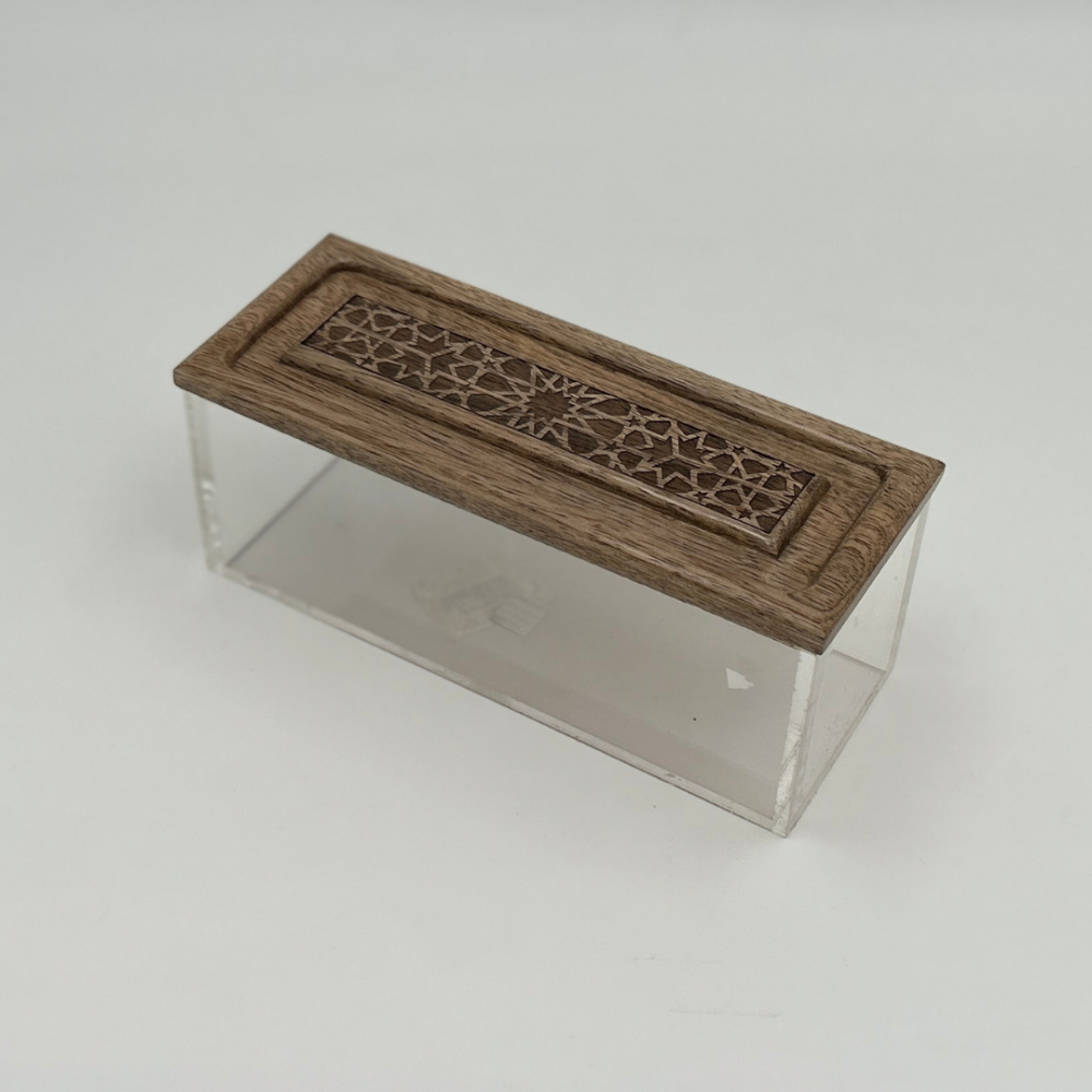 تقدم لكم علبة اكريليك بغطاء بتصميم عصري ونقش اسلامي فاخر، مما يجعلها الخيار المثالي لمحبي الأناقة والتميز. تتميز هذه العلبة بخامة الأكريليك الشفاف الذي يمنحها مظهرًا عصريًا، بينما يضيف الغطاء الخشبي المنقوش لمسة من التراث والثقافة. يتوفر الغطاء بخيارين، خشب فاتح وخشب غامق، مما يتيح لك اختيار الأنسب لديكور منزلك.