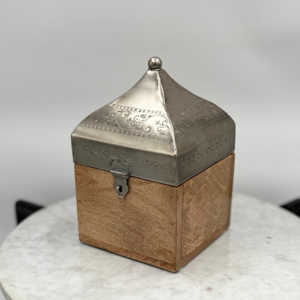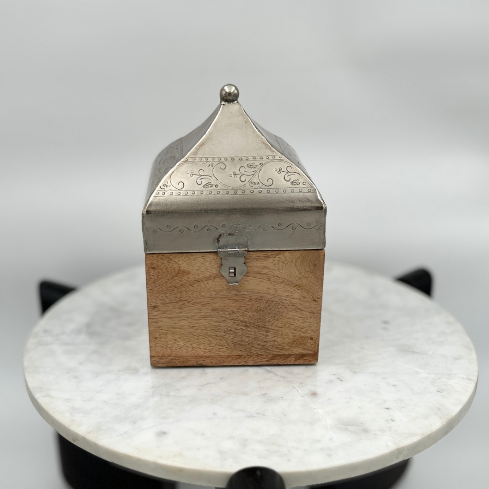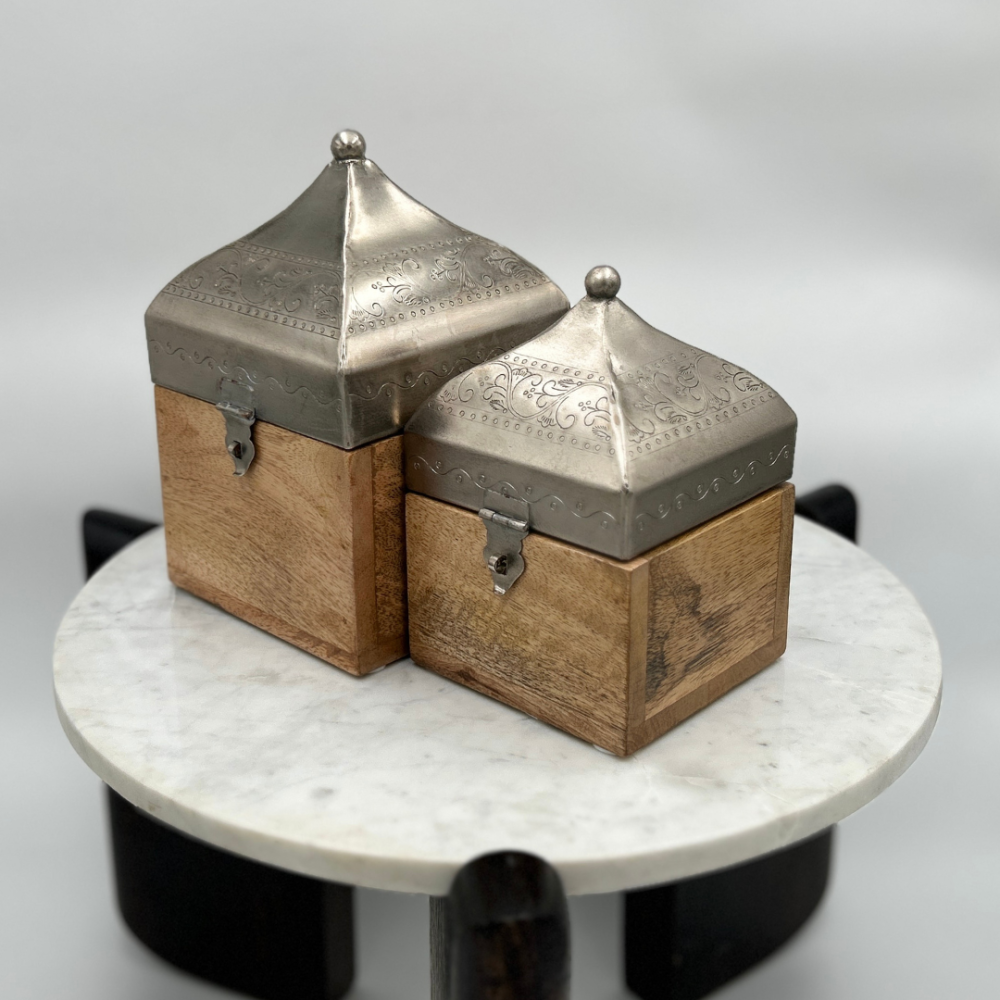استمتع بفخامة لا مثيل لها مع صندوق خشبي بغطاء أنيق، يجمع بين التصميم العصري والجودة العالية. يتميز هذا الصندوق الخشبي المربع بغطاء هرمي فضي منقوش، مما يجعله قطعة فريدة من نوعها تضيف لمسة من الأناقة إلى أي مساحة. يتوفر الصندوق بمقاسين مختلفين، حيث يبلغ حجم الكبير 14 سم × 14 سم بارتفاع 23 سم، بينما يأتي الصغير بحجم 11 سم × 11 سم وارتفاع 17 سم، مما يجعله مثالياً للتخزين أو كقطعة ديكور راقية.