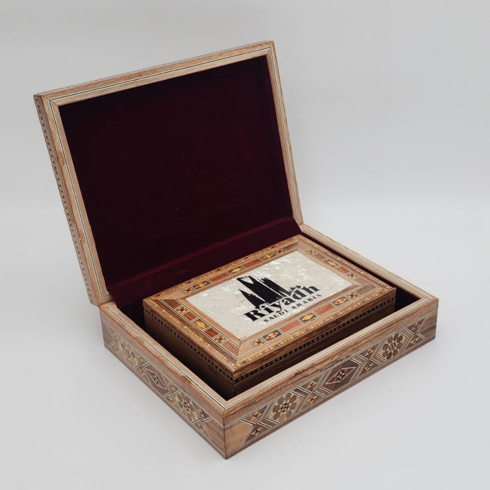 اكتشف جمال الحرفية السورية مع هذا الطقم الرائع المكون من 3 صناديق خشبية مصنوعة يدويًا من خشب طبيعي، ومع رسم مميز لمدينة الرياض بألوان الأسود والأبيض. هذا الطقم يجسد التراث الفني السوري ويحمل لمسات فنية رائعة تجسد تاريخ مدينة الرياض بشكل معاصر.